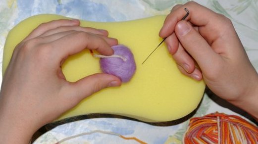 3. После того как вы сложили шарик, возьмите губку и иглу для валяния. Положите шарик так, чтобы вверху оказался хвостик шерсти и уколами иголочки (насквозь через шарик в губку) закрепите шерсть, чтобы шарик не разворачивался. Игла протолкнет шерстинки внутрь шарика, где они перепутаются с другими шерстинками.